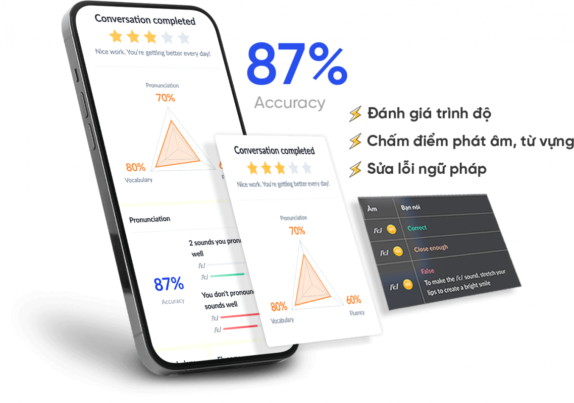 Được AI Tutor đánh giá trình độ và chấm điểm về từ vựng, phát âm và độ trôi chảy để biết điểm mạnh điểm yếu của bản thân. Thấy rõ sự tiến bộ sau từng bài học