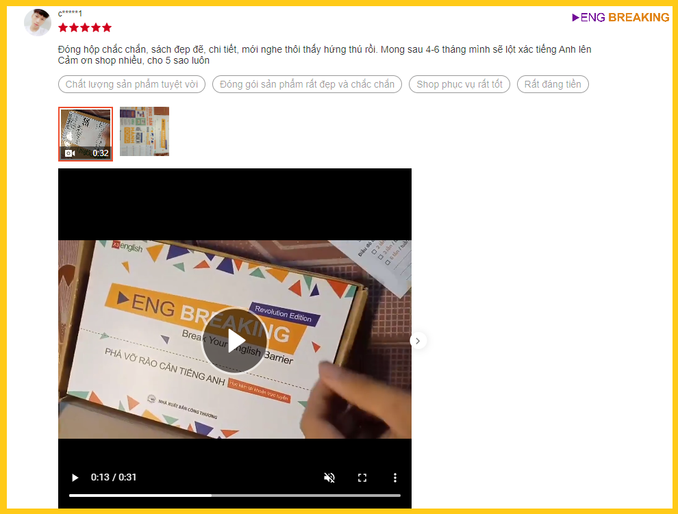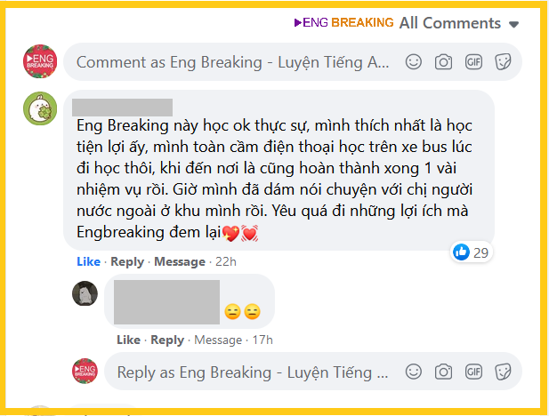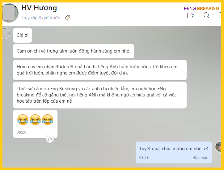 Lần đầu tiên mình được A môn tiếng Anh, nhờ vốn từ vựng và mẫu câu đa dạng hơn nhiều sau khi học Eng Breaking. Mình còn thuận lợi qua được kỳ thi tiếng Anh đầu ra và tốt nghiệp bằng giỏi nữa.