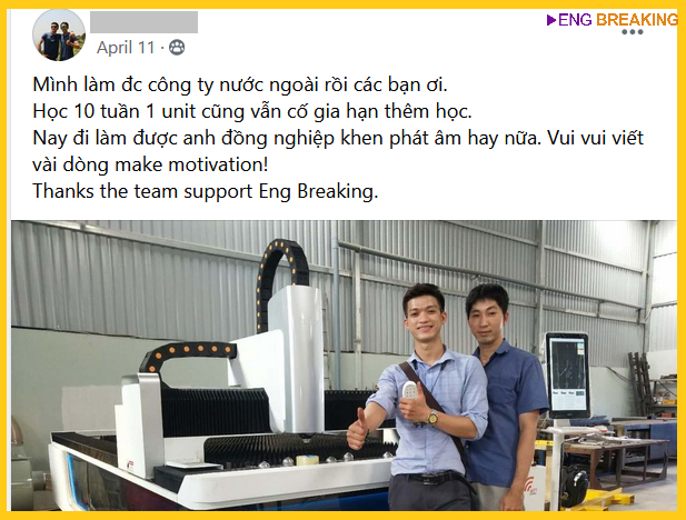 Vậy là đã hơn 3 tháng từ khi mình bắt đầu học khóa Eng Breaking của các bạn. Giờ mình đã thành thạo tiếng Anh, làm quản lý tại công ty nước ngoài, có thể đi du lịch, đi công tác khắp thế giới mà chẳng cần ngại ngần gì nữa.