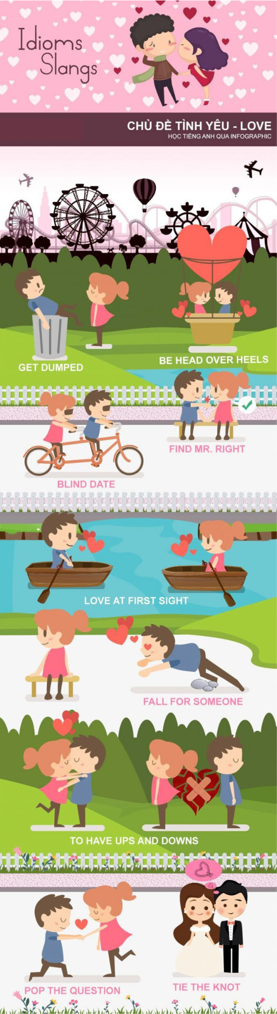 Infographic này có thú vị? Có giúp bạn học thành ngữ, từ lóng tiếng Anh về chủ đề tình yêu dễ dàng hơn không?