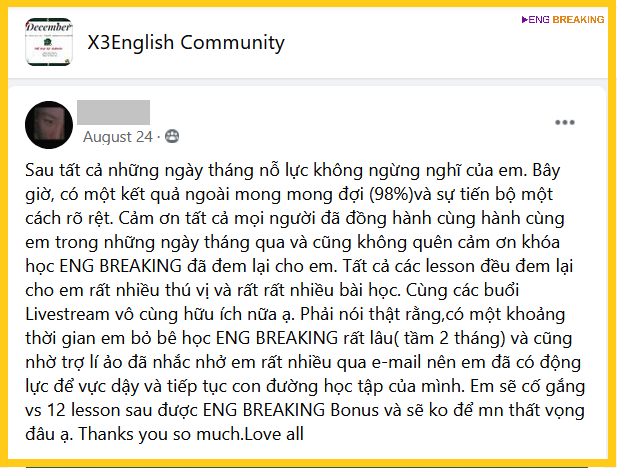 Em cảm thấy mình thực may mắn khi biết đến Eng Breaking. Hơn hai tháng em đồng hành cùng Eng Breaking. Em tự nhận thấy trình độ tiếng anh của mình đã lên rất nhiều luôn. Em sẽ cố gắng nhiều hơn nữa.