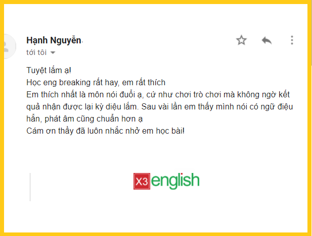 Vậy là đã hơn 3 tháng từ khi mình bắt đầu học khóa Eng Breaking của các bạn. Giờ mình đã thành thạo tiếng Anh, làm quản lý tại công ty nước ngoài, có thể đi du lịch, đi công tác khắp thế giới mà chẳng cần ngại ngần gì nữa.